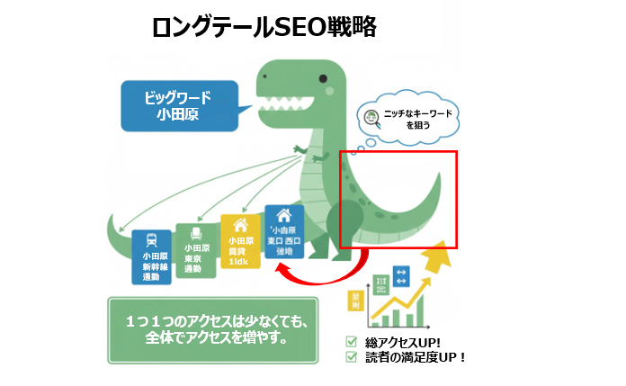 ロングテールSEOとは?検索ボリュームの大きい「小田原」のような一言キーワード(ビッグワード)ではなく、「小田原 新幹線 通勤」や「小田原 東京 通勤」のような3語以上の具体的でニッチなキーワードで検索結果上位表示を狙う手法です。恐竜の長い尻尾(ロングテール)のように、一つひとつのアクセスは少なくても、その記事をたくさん積み上げることで、合計のアクセス数を大きくしていく作戦です。ライバルが少ないので、個人ブログでも検索上位を狙いやすいのが最大のメリットです。